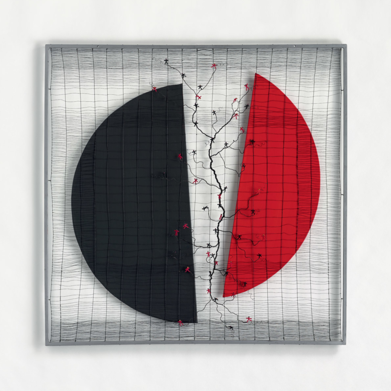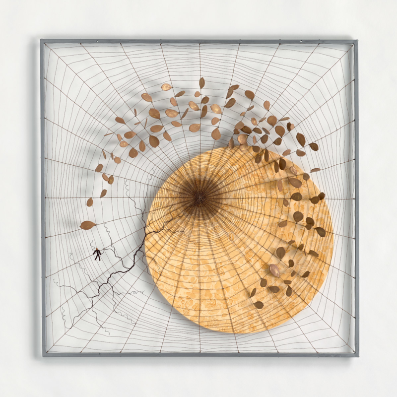 Au départ il y a ses mains, fermes comme le sont celles de ces femmes de la terre. Rapides, elles attrapent les objets initiaux qui vont nous mener sur le fil ténu du voyage. À peine l’on pénètre dans l’atelier de Pierrette Gonseth-Favre que l’on devine la précision, la sûreté du geste. Pas de place, ou si peu, pour le hasard, mais la découverte voulue de l’artiste. Assise à sa table de travail, le regard s’aiguise, se concentre, rentre dans la sarabande de l’œuvre, du monde. Le reflet cache sa beauté: «ombre et silence», «La moisson du voyageur», autant de tableaux de fils tendus, insolites, poétiques, qui rappellent les souvenirs de son enfance. Celle de la vigne, du rythme des saisons et des chants mâtinés de tendresse et de découvertes.