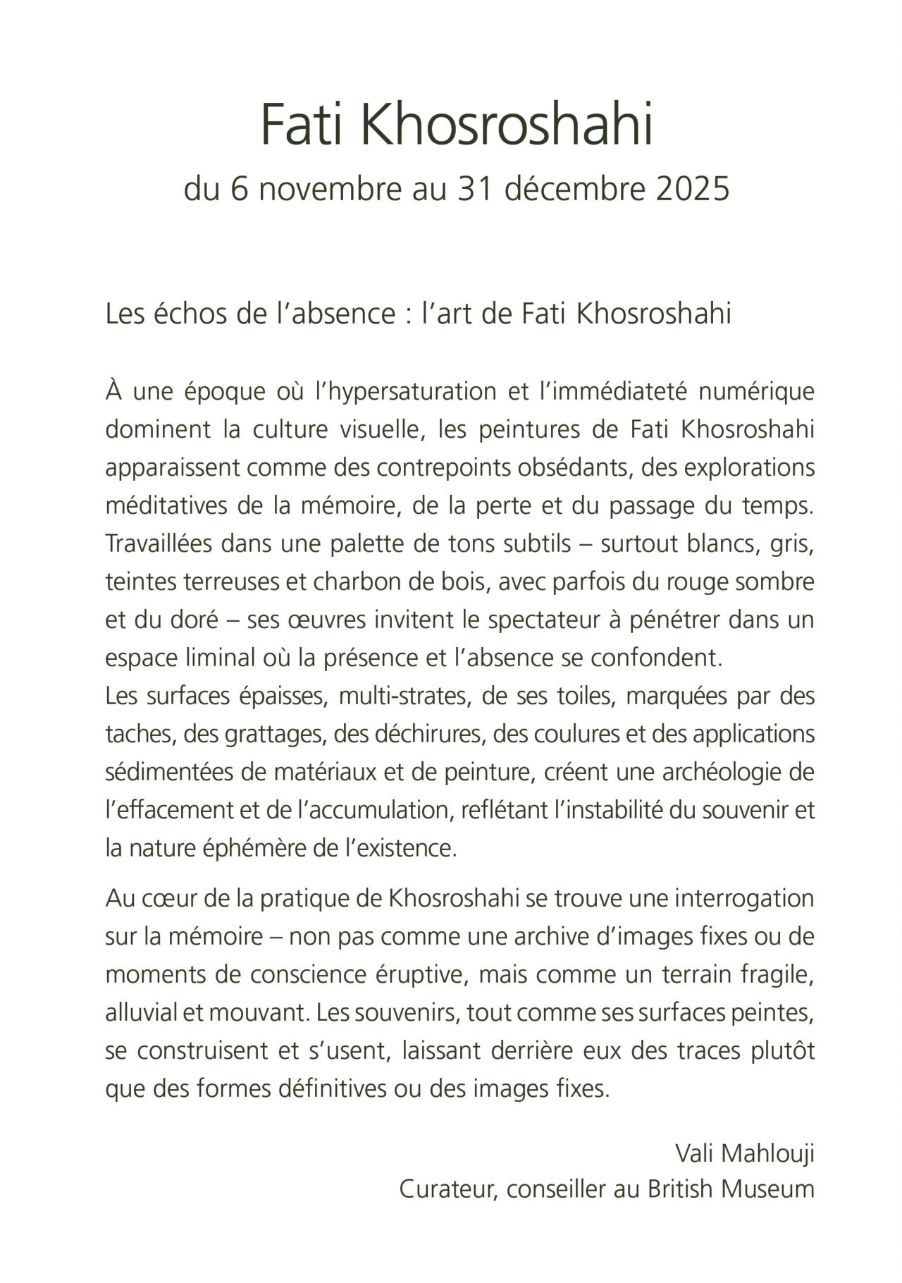 Les œuvres de Fati Khosroshahi nous confrontent à une question complexe : comment représenter picturalement des idées ou des phénomènes parmi les plus importants dans nos vies, de ceux qui nous accompagnent tous et toujours ? Chacun y apportera sa réponse propre bien sûr. Bien souvent, toutefois, celle-ci sera illustrative et référentielle.