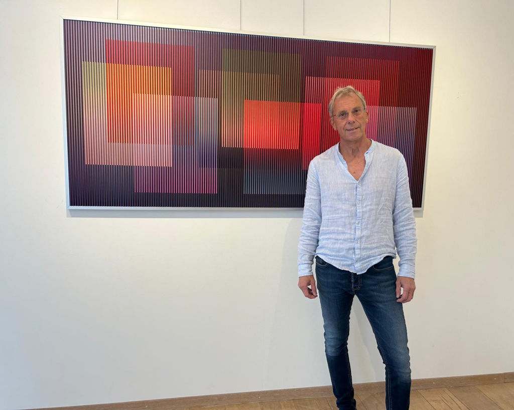 Inspiré actuellement par les recherches de Cruz-Diez et plus largement par les grands noms de l’art cinétique non-motorisé, tels Sotto ou Agam, l’artiste propose ici des tableaux que nous animons en nous déplaçant. Dans ce nouveau jeu d’optique, c’est le spectateur qui crée le mouvement.
