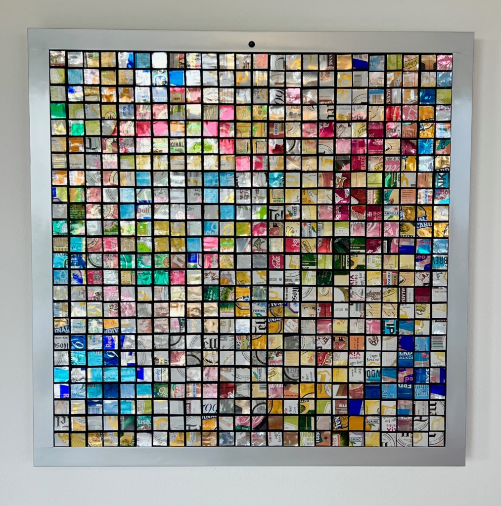 « Sans titre », 2019, 100 x 100 cm, 576 modules mécaniques montés sur une grille régulière, plaquettes recouvertes d’aluminium fin (surface réfléchissante),