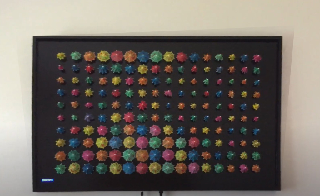 L’œuvre est composée d’un ensemble de parasols colorés. Chacun est actionné par un petit servomoteurs, qui contrôle le geste simple mais délicat de l’ouverture et de la fermeture. Le tout est piloté par un microcontrôleur programmable ,