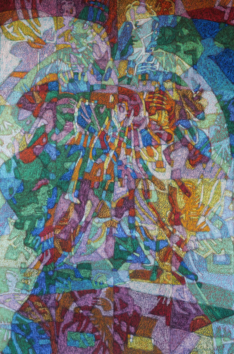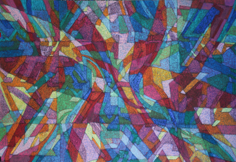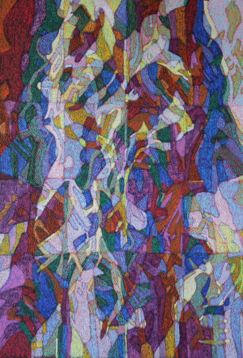 Assis sur une chaise orange pivotante, le peintre frotte un pastel à coups répétés sur une toile déjà bien couverte de couleurs. La toile est fixée par des épingles à linge bleues, rouges et jaunes à un grand panneau en bois noir appuyé contre deux chevalets eux-mêmes adossés à un mur sale. Pourquoi ajoute-t-il du bleu sur une surface déjà bleue ? Ou bien du noir sur un petit demi-losange noir ? Les lignes de couleurs qui parcourent la surface forment les rayons d’un astre absent ou simplement hors champ. Le peintre parle : « Je cherche un équilibre qui permette aux couleurs de flotter. » Par le grand vasistas encadré de toiles d’araignée, un arbre agite doucement quelques feuilles, histoire d’être poli. Vues de dos, les grandes oreilles du peintre, plaquées de part et d’autre de son crâne, retiennent bien les branches de ses lunettes. Cela fait vingt bonnes minutes que le peintre s’acharne sur le coin supérieur droit de sa toile. À la radio s’achève la diffusion d’un quintette de Robert Schumann. Tout ce qu’il y a d’enfantin dans le coloriage a disparu, tout sauf la patiente répétition du geste. On s’attend à voir apparaître sur la toile une figure géométrique, une forme identifiable, mais non, rien. Ou peut-être que si, mais allez savoir quoi. Dans la pièce voisine, posée sur un tréteau, une pile de tableaux terminés. Le sont-ils vraiment ? Voici le peintre penché sur le coin inférieur gauche de sa toile : effet d’une nostalgie de diagonale ? Vaporisation à l’aérosol d’un jet de fixatif. À la radio, le canal France-Musique annonce un concert Janacek. Pour frotter le pastel, il faut lever le coude à l’horizontale, plus haut que pour boire un coup. Le temps fraîchit, les nuages passant devant le vasistas gonflent leurs joues. À partir de quand dira-t-on d’une activité qu’elle devient fastidieuse ? Le peintre pose son bâtonnet, en choisit un autre, le considère puis le range à son tour dans la boîte. Après une hésitation, il saisit un troisième pastel qui semble cette fois être le bon. L’atelier sent la poussière, la cendre et l’aggloméré humide. Le peintre se gratte le menton en regardant le résultat de son travail de l’oeil avec lequel sa bouvier bernoise observerait une boîte de sardines. Vue en profil perdu, l’oreille gauche du peintre est plus grande que la droite. Sous le soleil descendant, certaines zones de la toile ont l’air d’être recouvertes d’un vernis brillant. Le volume de la radio est faible. Symphonie Mort à Venise de Gustav Mahler en sourdine insistante. Frottis de pastel sur la toile. Le peintre travaille lentement et assez régulièrement. Une fenêtre avec ses deux battants entrouverts ou entrefermés se distinguerait ou se devinerait ou s’imaginerait au centre de la toile ? Peut-être. Un chat noir pénètre à pas de velours dans l’atelier et inspecte les lieux avant d’aller s’étendre dans la pièce voisine. Il est cinq heures de la tarde. Le peintre dit : « Le plaisir, c’est que j’ai toujours du travail ».
